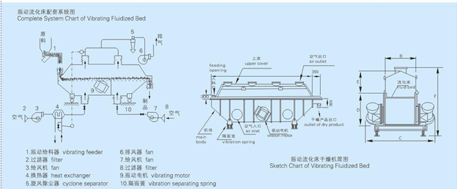 物料自進(jìn)料口進(jìn)入機(jī)內(nèi), 在振動(dòng)力作用下, 物料沿水平方向拋擲向前連續(xù)運(yùn)動(dòng),熱風(fēng)向上穿過(guò)流化床同濕料換熱后, 濕空氣經(jīng)旋風(fēng)分離器除塵后由排風(fēng)口排出, 干燥物料由排料口排出。